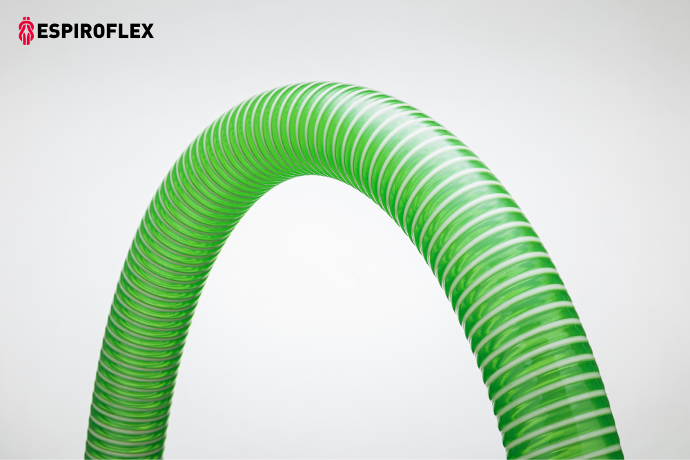 Tubería de PVC flexible libre de ftalatos reforzada con espiral de PVC rígido antichoque y con capa interna de PU base poliéster.