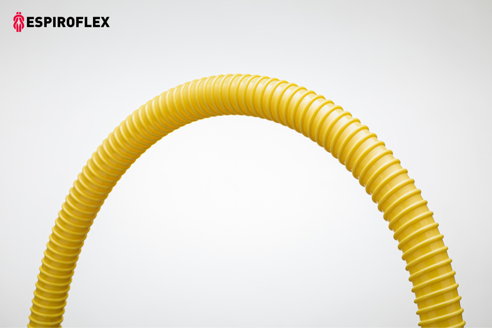 Tubería de PVC flexible reforzada con espira de PVC rígido antichoque, utilizada como vaina de protección en instalaciones de tuberías de cobre empotradas en muros. De uso industrial especialmente en el sector de la construcción. Difícilmente deformable por aplastamiento. Resistente a impactos. Autoextinguible según norma UL94 categoría V0. Buena resistencia a la química asociada a la tabla de resistencias del PVC (incluyendo a los decapantes de cobre más habituales). Muy flexible y manejable.