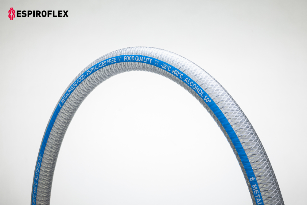 Manguera de PVC con doble refuerzo, textil y espiral metálica. Baja permeabilidad a los olores para la aspiración e impulsión de líquidos del sistema de descarga de aguas negras en embarcaciones.