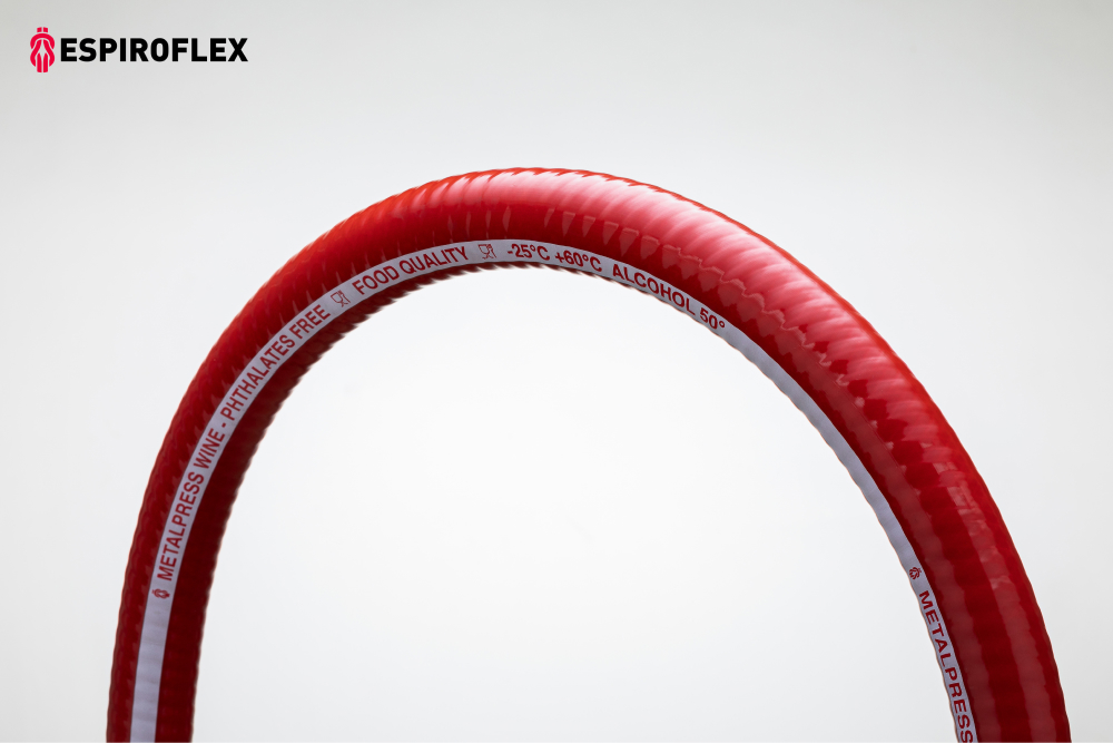 Manguera de PVC sin ftalatos con doble refuerzo, textil y espiral metálica, para aspiración y trasvase de líquidos alimentarios y alcohólicos a 50°, así como lácteos. Especialmente indicada para aspiración e impulsión de mostos, vinos, cervezas y licores. Disponible versión con resistencia a 90°C. Buena resistencia a la presión y al vacío en aspiración.