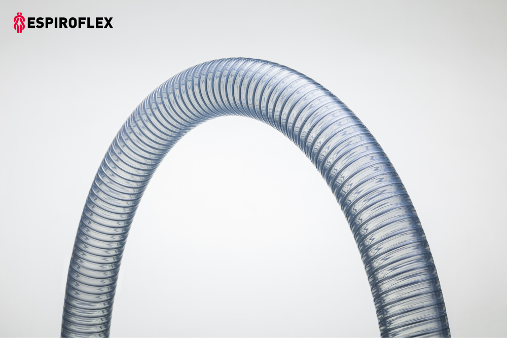 Manguera sin ftalatos para trasvase de aire, granzas plásticas, líquidos alcohólicos a 50°, alimentos líquidos y para bombas de vacío. Reforzada con espiral de acero cincado, que la dota de resistencia al vacío.