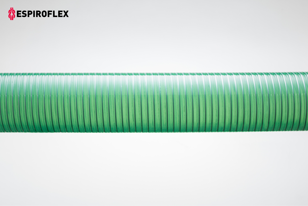 Tubería de PVC flexible sin ftalatos, reforzada con espiral de acero cincado y con capa interior de PU base poliéster. Gran resistencia a la abrasión. Buena resistencia a la presión y al vacío en aspiración.